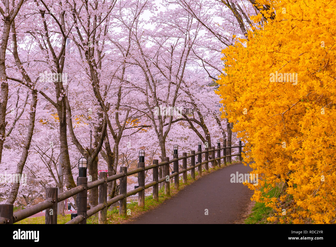 Forsythia Field Pathway With The Cherry Blossom Tree Background In Funaoka Castle Ruin Park Miyagi Prefecture Japan Stock Photo Alamy